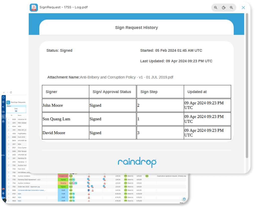 RainSign is Raindrop’s built-in e-signature solution that enables users to generate, send, and track legally binding digital signatures for contracts and documents. It eliminates the need for third-party signature tools and integrates seamlessly with contract workflows within the Raindrop platform.