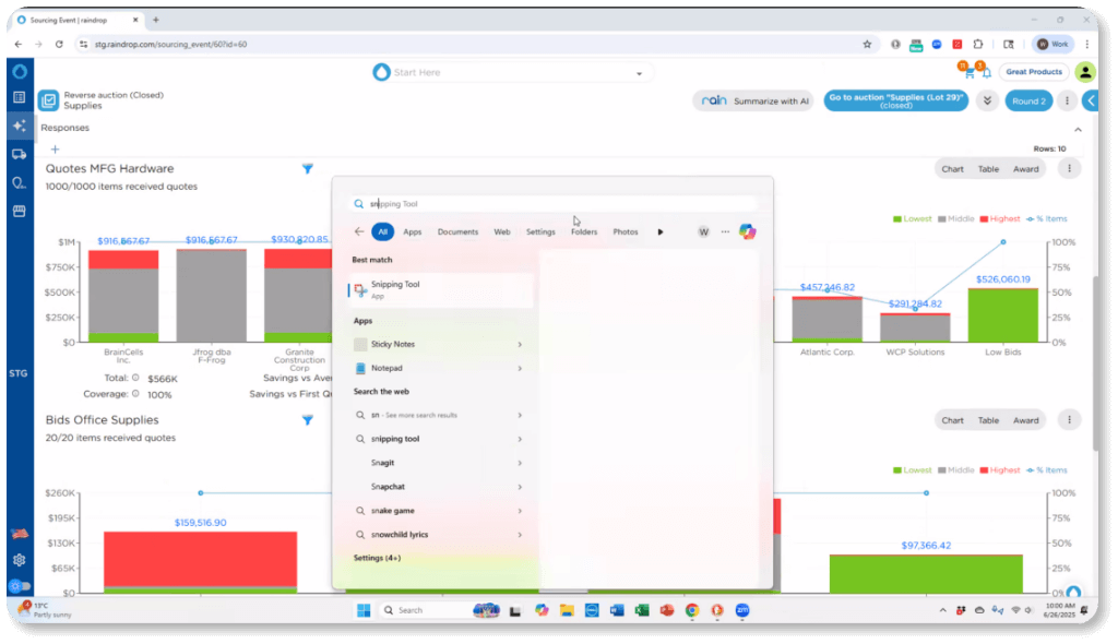 Raindrop simplifies sourcing by automating repetitive tasks, centralizing communications, and enabling real-time collaboration. Users can launch events in minutes, compare bids side-by-side, and maintain complete visibility throughout the sourcing lifecycle—from intake to award.