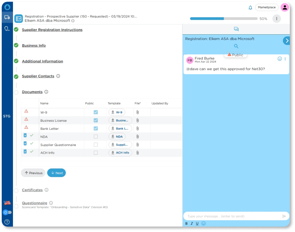 Yes. Raindrop automates supplier onboarding through configurable workflows, forms, and automated approvals. This includes collecting required documentation, verifying compliance, and conducting risk assessments. Procurement teams can standardize the process while keeping suppliers accountable and engaged.